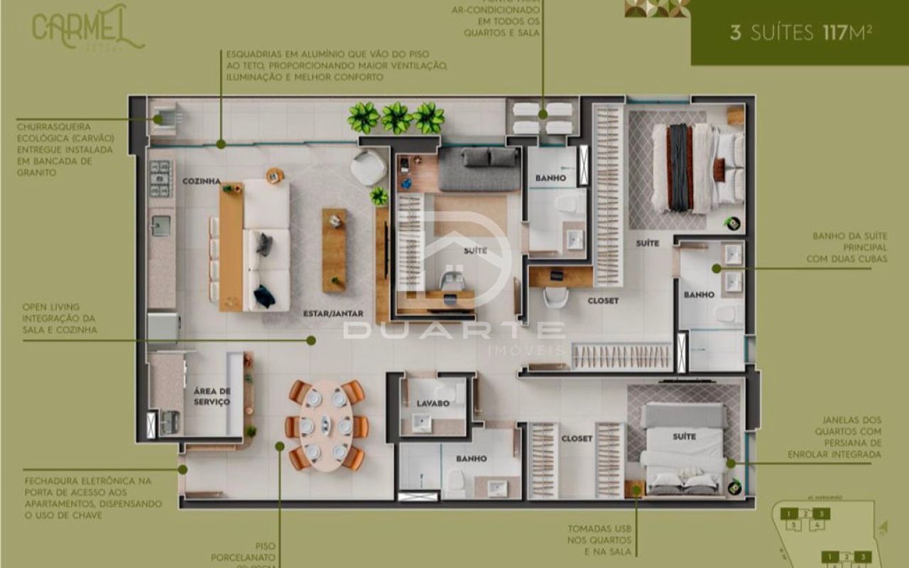 - Ponto para ar-condicionado em todos os quartos e sala;
