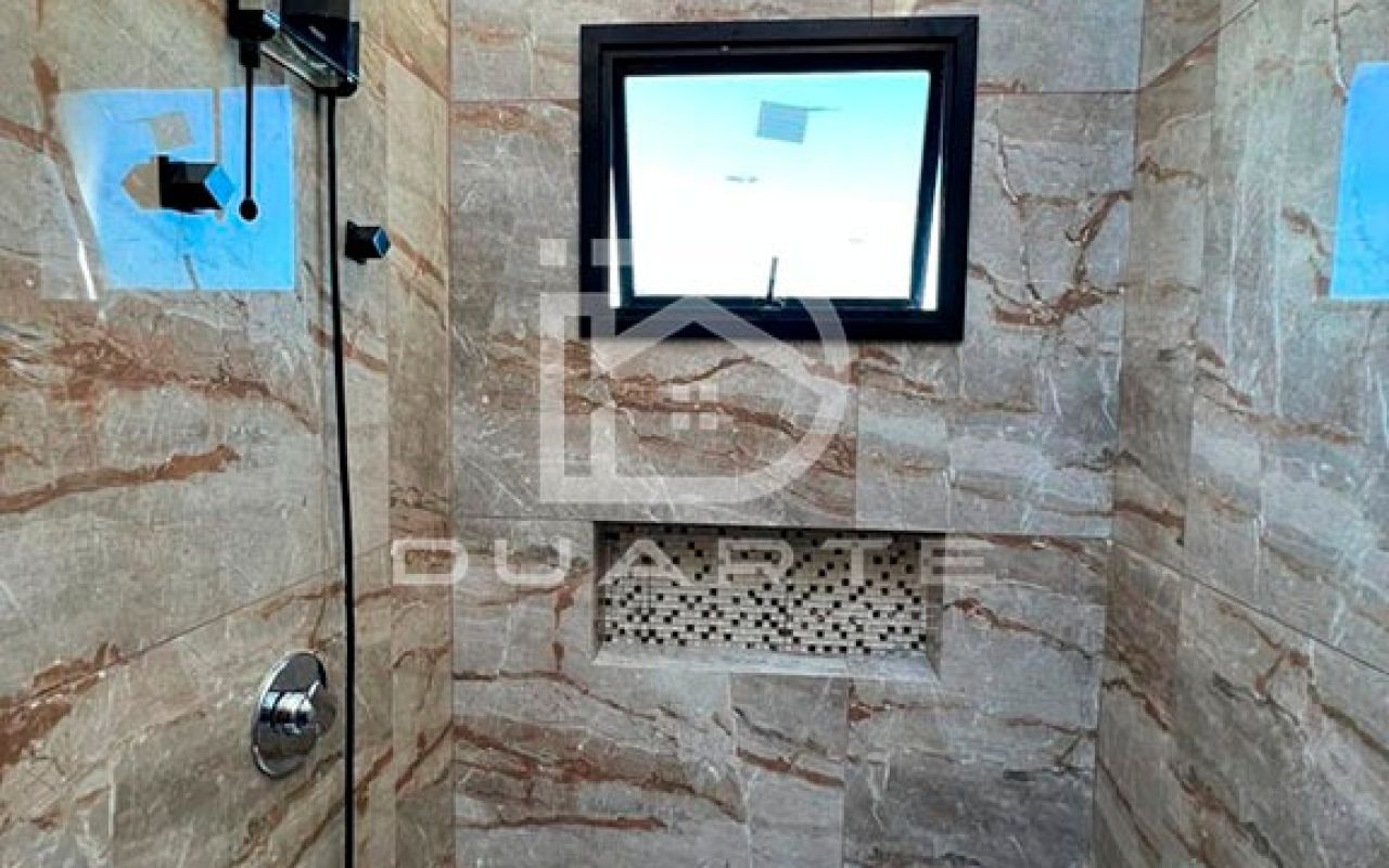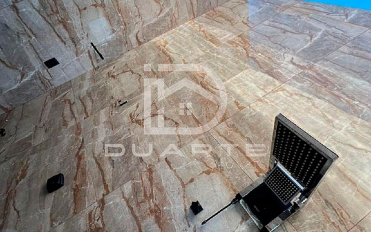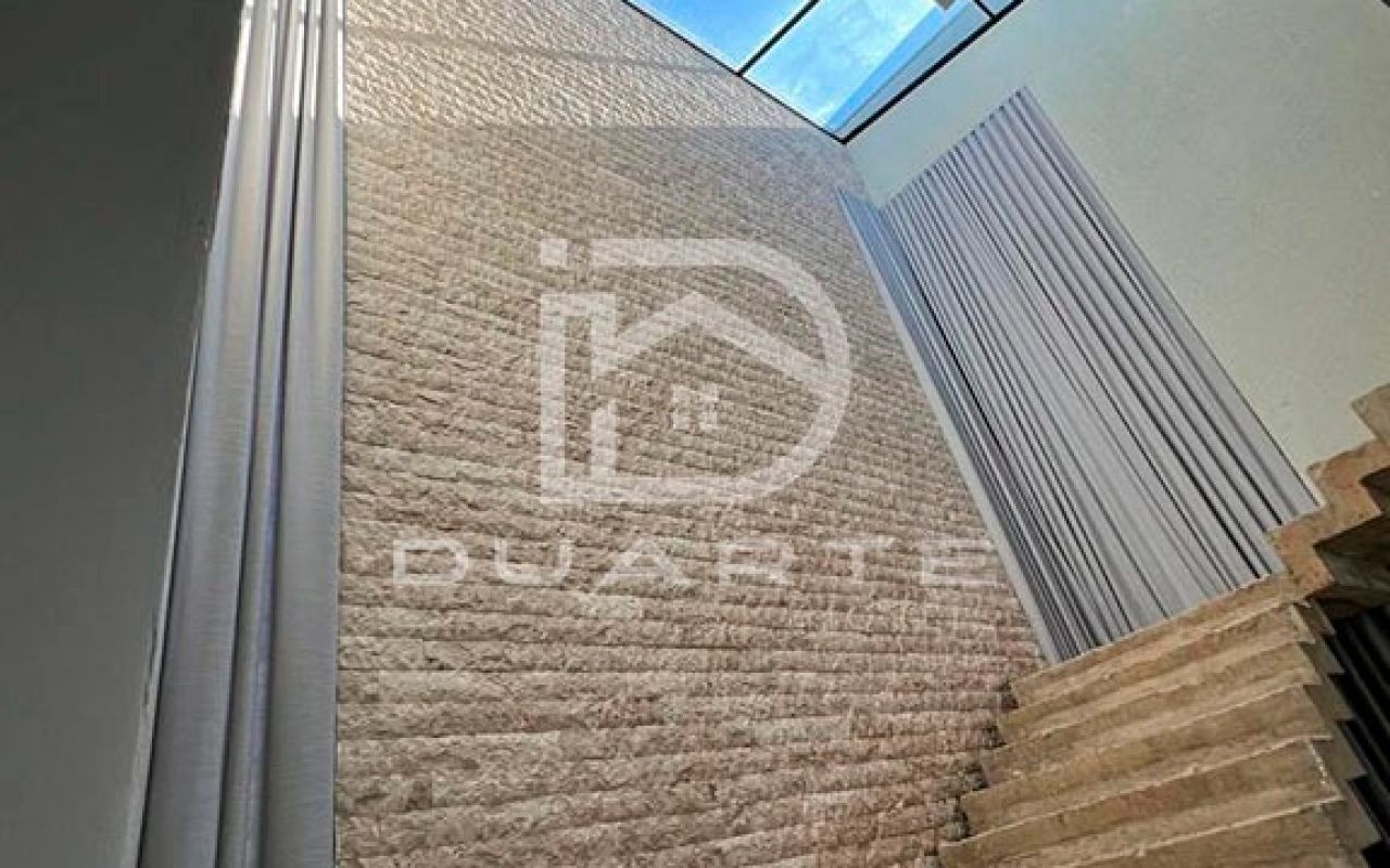 - Travertino, ripado e esquadria preta.