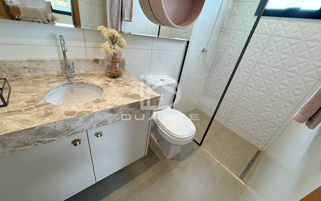 - Bancadas em mármore nos banheiros e granito na cozinha;